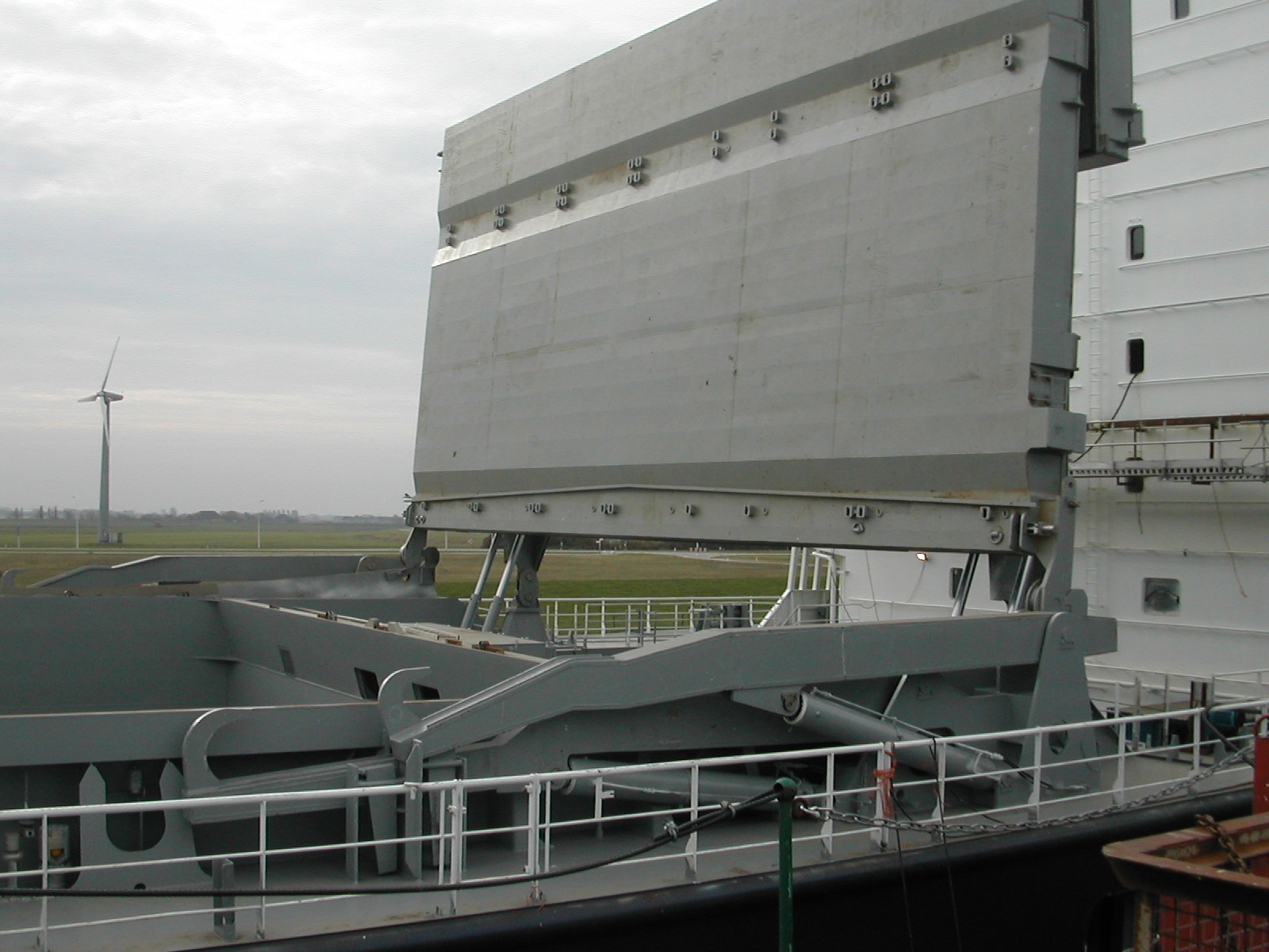 The folding pair is operated by hydraulic cylinders acting directly on the end hinge arms, which are connected at stools on the deck. When the cylinders push the end panel up from the closed position, the cover folds and the second panel, fitted with wheels, rolls on rails to a stowage position. The panels are usually secured in the open position by semi-automatic locking devices interacting with the wheel arms.